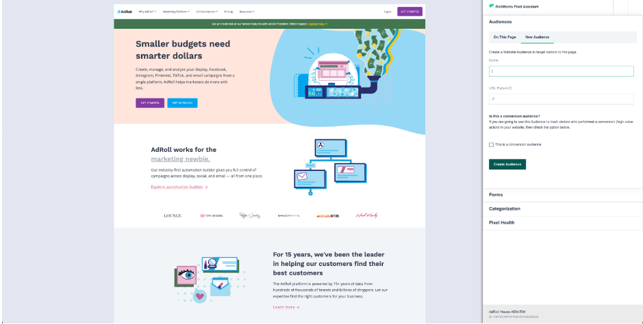 Under the Audiences or Website Audiences tab on the AdRoll and RollWorks platforms, respectively, customers can access various pixel-related tools.
